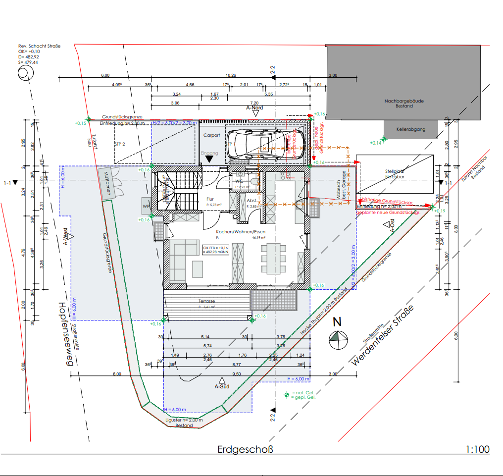 Gefälle und Höhenlagen: Der Hausanschlussschacht Straße weist eine Oberkante FFB von +0,16 m bzw. 482,98 m ü NN, das Roh Schachtsohle (S) liegt bei 479,44 m NN (D = 482,92 m)