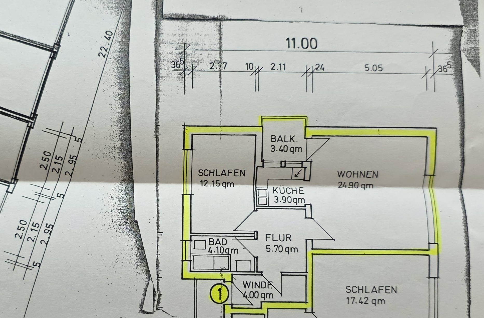 Die Wohnung umfasst ein großzügiges Wohnzimmer mit breiter Fensterfront zum Hof, ein helles Schlafzimmer, eine Küche mit Fenster, Balkon, sowie Bad, Diele und Flur. Kunststofffenster mit Doppelverglasung (erneuert 2009) sorgen für gute Lichtverhältnisse, die zentrale Gasheizung (Wärmeerzeuger 2002) für effizientes Heizen. Der Energieverbrauch liegt bei soliden 107 kWh/(m²·a) (Verbrauchsausweis 2018). Die Elektrik (ca. 1980er/1990er) und Sanitär sind funktionsfähig, aber renovierungsbedürftig, Wände, Böden und Bad laden zu individuellen Gestaltungsideen ein.