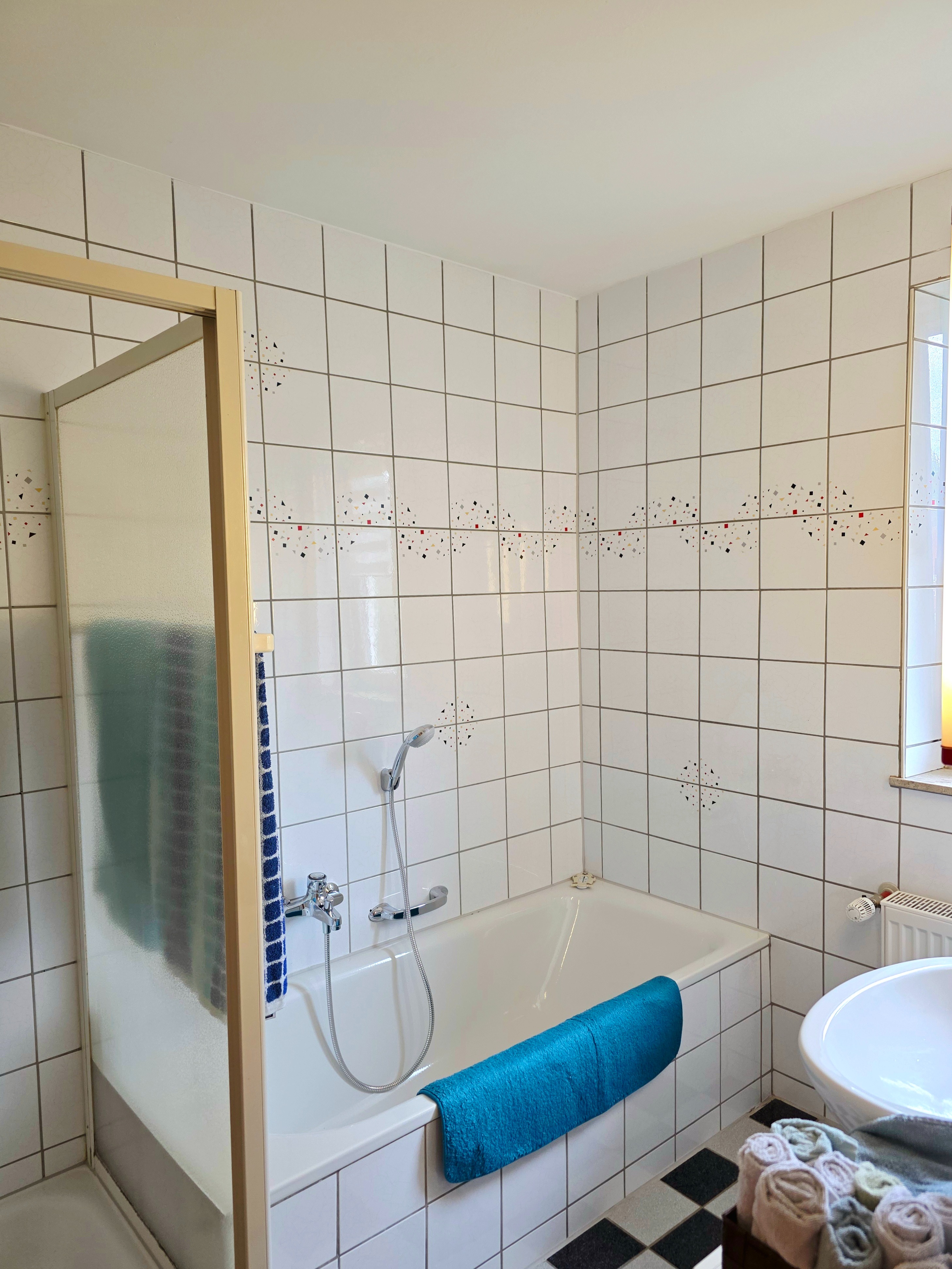 Tageslichtbad mit Wanne, Waschbecken, Waschmaschinenanschluss (im Keller)